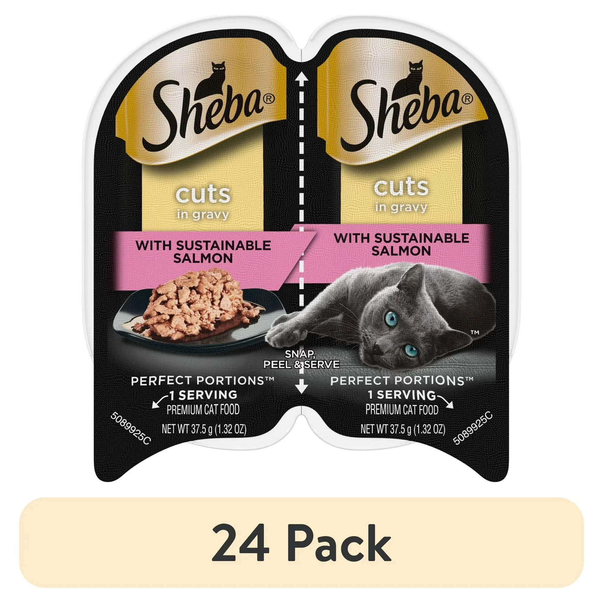 - (24 pack) Sheba Perfect Portions Cuts In Gravy With Sustainable Salmon Cat Food, 2.6 Oz Twin-Pack Tray (24 pack) Sheba Perfect Portions Cuts In Gravy With Sustainable Salmon Cat Food, 2.6 Oz Twin-Pack Tray
